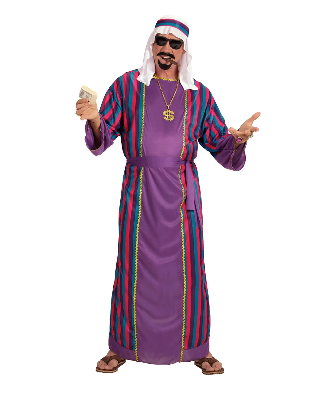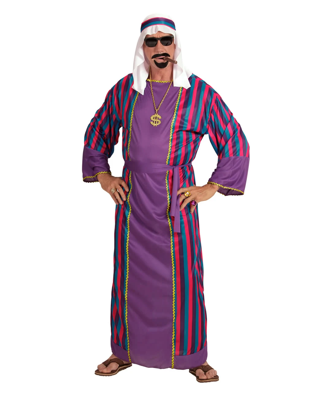 Das arabischer Scheich Kostüm besteht aus einem langen, violett gefärbten Gewand mit bunten Streifen als Motiv. Der dazu passende Gürtel und das für Araber typische Kopftuch lassen dich wie ein klassischer Sultan aussehen. So verkleidet bist Du perfekt für Fasching, Karneval und Mottopartys wie 1001 Nacht verkleidet. Schuhe, Zigarre, Mobiltelefon und Schmuck sind nicht im Lieferumfang enthalten.
