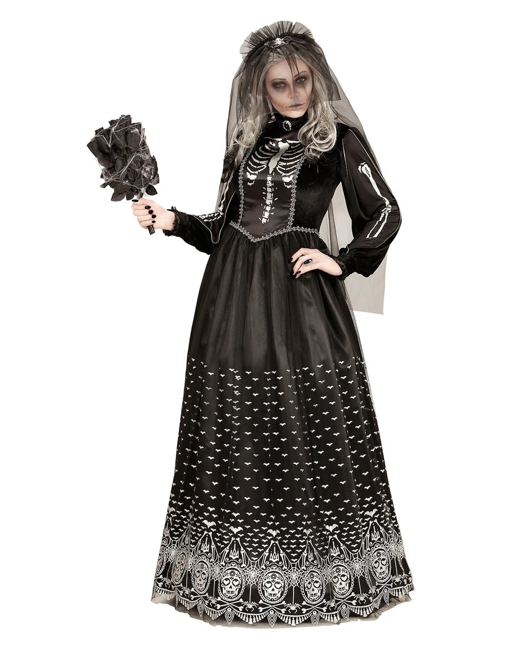 Nicht nur am Tag der Toten machen Sugar Skull Ladys & Gentlemen die Gegend unsicher. Auch zu Halloween sind Day of The Dead Kostüme für Frauen & Herren absolut im Trend. Dieses wunderschöne Damen Halloween Kostüm besticht durch düstere Eleganz – genau richtig, um am 31. Oktober Schauerstimmung zu verbreiten. Das Day of The Dead Skelettbraut Kostüm besteht aus einem schwarzen Halloween Kostümkleid mit Reifrock und einem Brautschleier. Mit einem passenden Dia De Los Muertos Make-up wirst du zur wunderschönen, schwarzen Braut und bekommst im Nu das Ja-Wort deines Bräutigams.