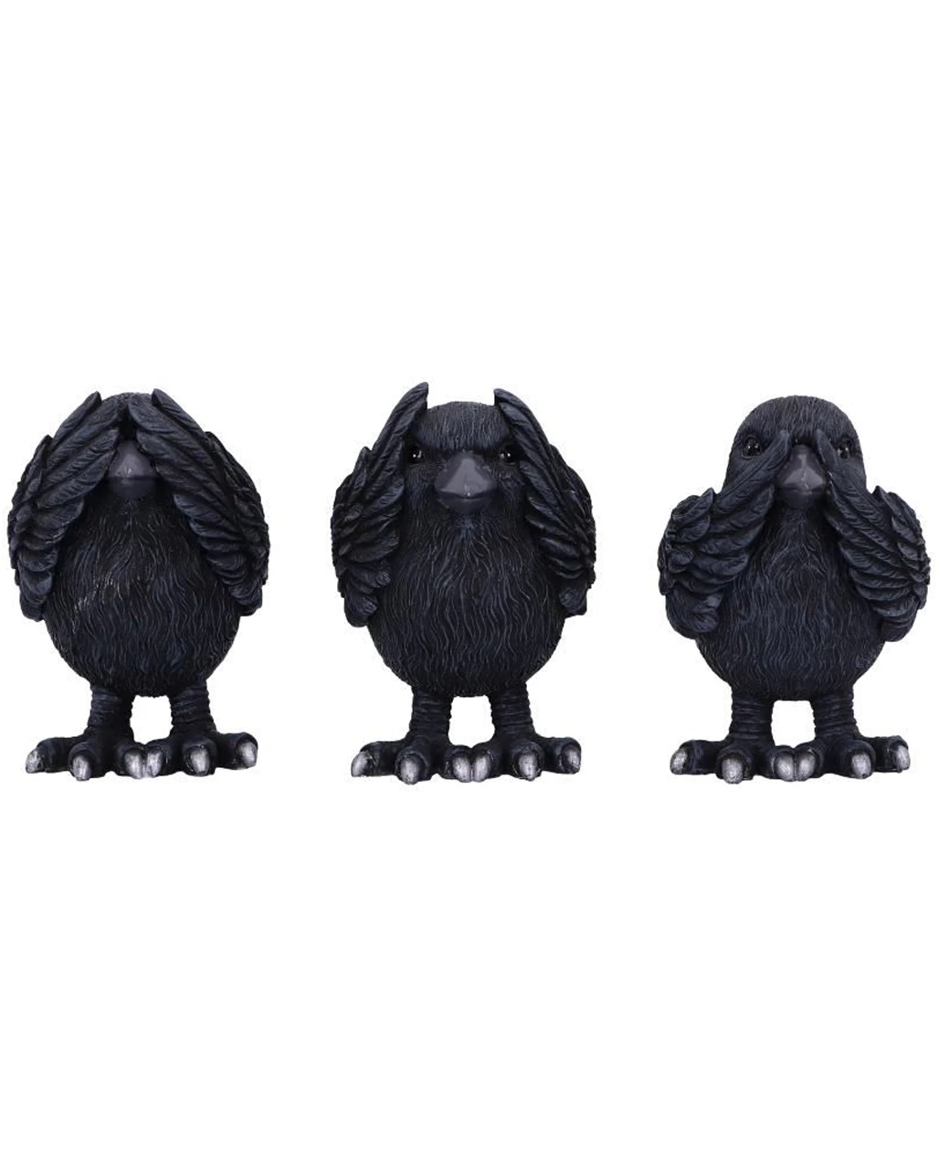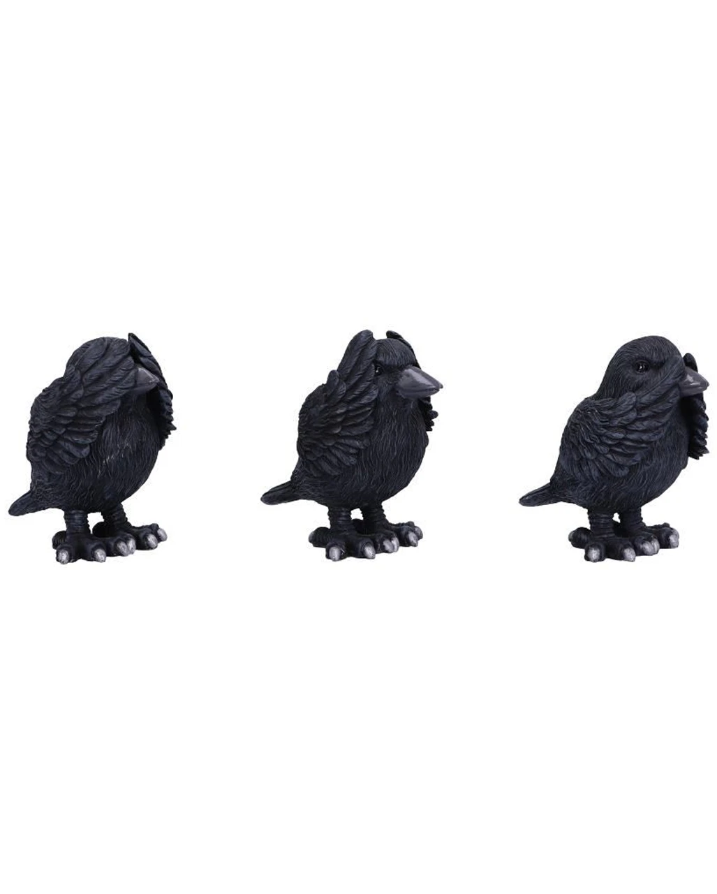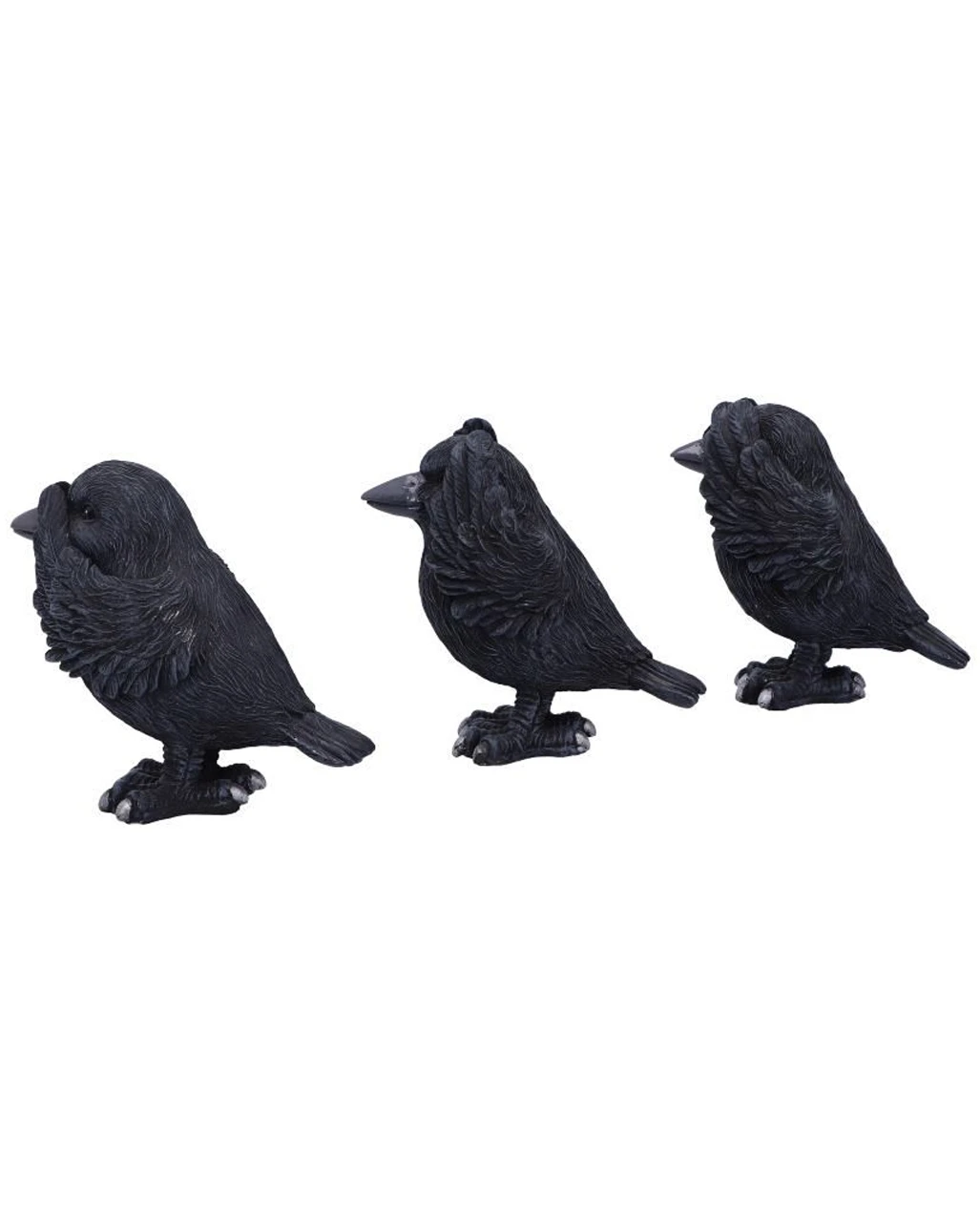 Seite an Seite stehend, hält der eine schwarze Vogel der Nacht seine Flügel über die Augen, der andere hält sich die Ohren zu, während die dritte Krähe verzweifelt ihren Schnabel zuhält. Unsere Drei Weise Raben 9cm sind die perfekte Deko für Fans von Konfuzius, Gothic & Halloween.