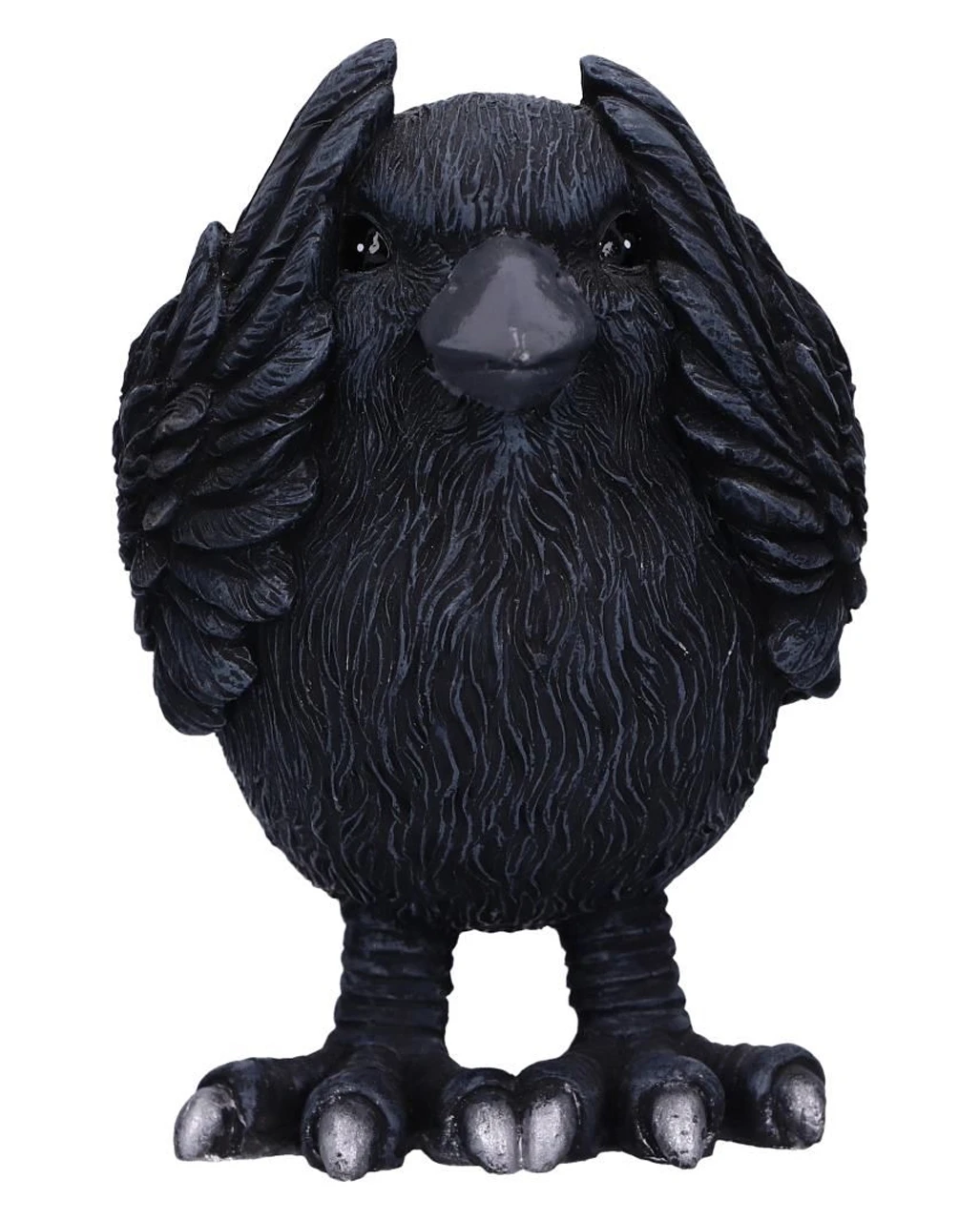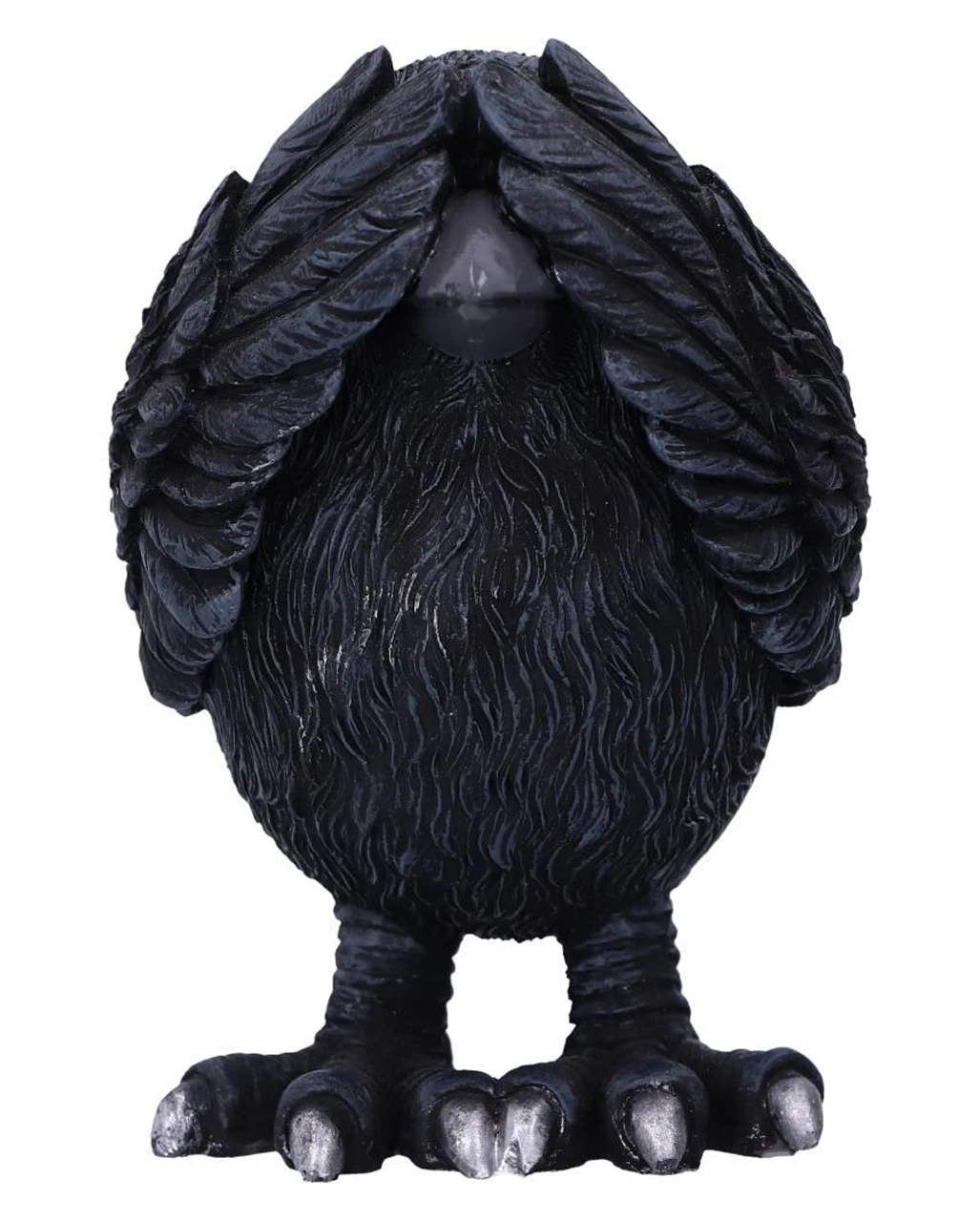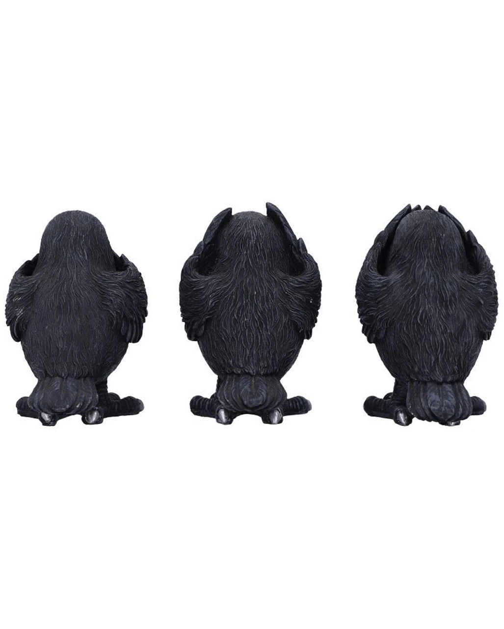 Seite an Seite stehend, hält der eine schwarze Vogel der Nacht seine Flügel über die Augen, der andere hält sich die Ohren zu, während die dritte Krähe verzweifelt ihren Schnabel zuhält. Unsere Drei Weise Raben 9cm sind die perfekte Deko für Fans von Konfuzius, Gothic & Halloween.