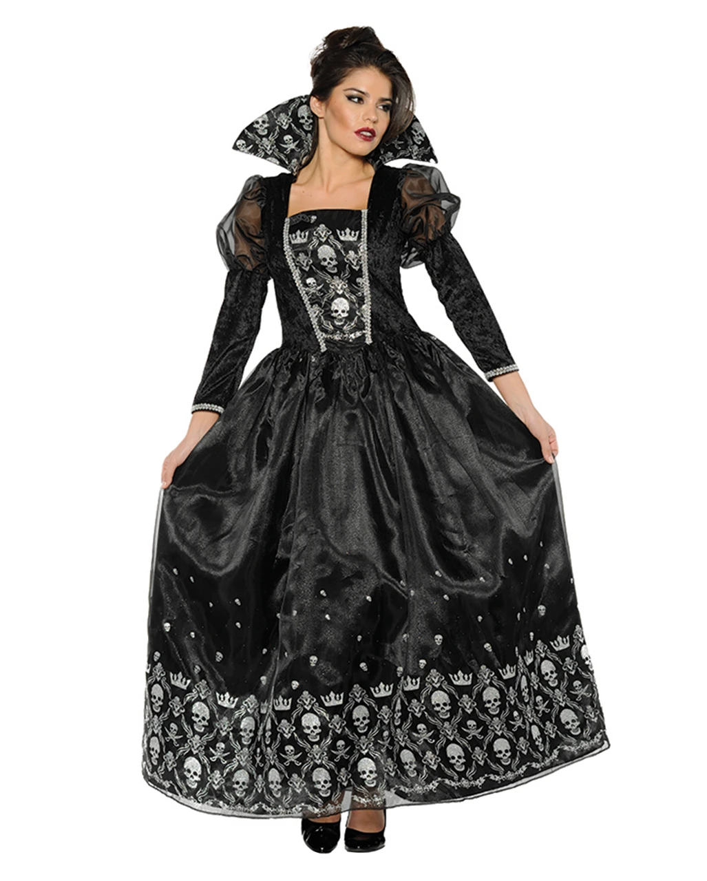Das Dunkle Königin Kostüm besticht durch seine schöne Optik. Das bodenlange, schwarze Kleid mit angedeuteter Corsage verleiht dir einen geheimnisvollen, düsteren Touch. Verzierungen in Form von Totenschädeln, manche davon mit gekreuzten Säbeln anstelle von Knochen, schmücken das elegante Herrscherin-Kostüm an Kragen, Saum und Rock. Stilisierte Kronen geben dich deutlich als Regentin zu erkennen. Die zahllosen glitzernden Pailletten der sexy Halloween-Verkleidung lassen dich funkeln und machen dich zum absoluten Blickfang! Dazu empfehlen wir die Halskette mit schwarzen Perlen und Schmucksteinen und die Evil Queen Krone mit Glitter.