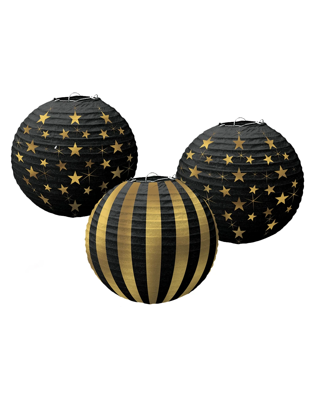 Für Jubiläen, Geburtstage oder Mottopartys sind Lampions aus Papier eine geniale Deko-Idee. Unser Glitz & Glam Lampion Set 3 Stück ist eine geniale Decken-Dekoration für Disco-Mottofeten oder Halloween. Das Lampion Set enthält 3 schwarze Lampions mit Sternen und Streifen in Gold. Sorge für stimmungsvolle Akzente und dekoriere deine Party-Location mit der Lampion Hängedeko von Horror-Shop.com!