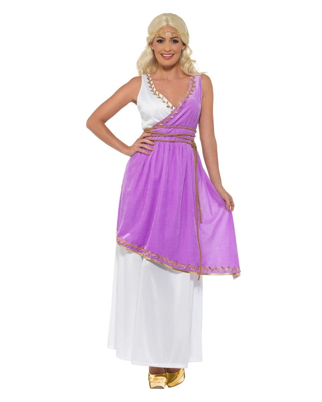 Das Griechische Göttin Rhea Kostüm besteht aus einem wunderschönen, bodenlangen Kleid, einem Gürtel und einem Stirnband. Goldene Ziernähte schmücken die ärmellose Karnevals-Verkleidung an den Säumen und die lila-weiße Farbgebung sorgt für einen wahrhaft göttlichen Anblick. Ein goldenes Stirnband sowie ein dünner, ebenfalls goldener Gürtel runden deine Erscheinung als erhabene Gottheit der griechischen Mythologie stimmig ab. Dazu passen das Griechische Göttin Make Up Set und die Göttinnen Perücke mit Lorbeerblättern blond.