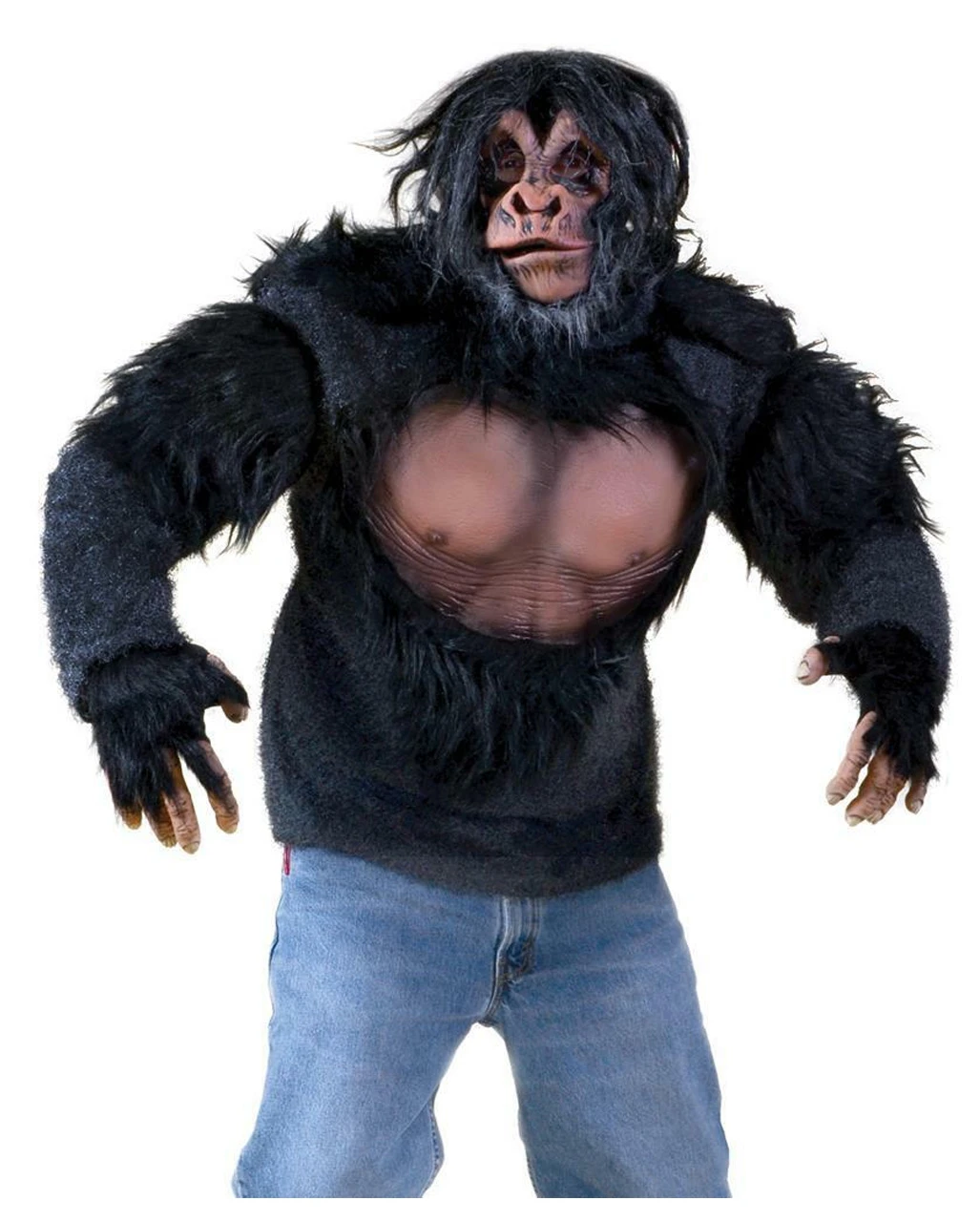 Das schwarz-grau melierte, weiche Affenshirt ist rundherum mit Kunstfell ausgestattet, hat lange Ärmel und auf der Vorderseite eine großen Latex Applikation einer Affen-Brust. Zusätzlich wattierte Schultern verleihen dem Affenshirt eine eindruscksvolle Schulterbreite. Als Kostümzubehör wird das Affenfell einfach übergezogen. Passend dazu wäre zum Beispiel unsere Schimpansen Maske Deluxe. Affenmaske und Handschuhe sind nicht im Lieferumfang enthalten.
