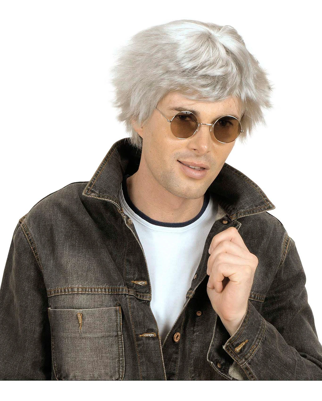 Die platingraue Herrenperücke mit Ihrer auffälligen Frisur ist einem bekannten Graphik Künstler nachempfunden, kann aber auch andere Charaktere wie Popstar, Hippie oder Altrocker perfektionieren. Die Silbergraue Perücke ist fransig und stufig geschnitten, nackenlang und besitzt ein Fransen Pony. Weitere verschiedene Männerperücken findest du in unserem Shop. Dazu passen verschiedene Brillen wie die Schwarzes Brillengestell ohne Gläser und der Basic Body Schwarz