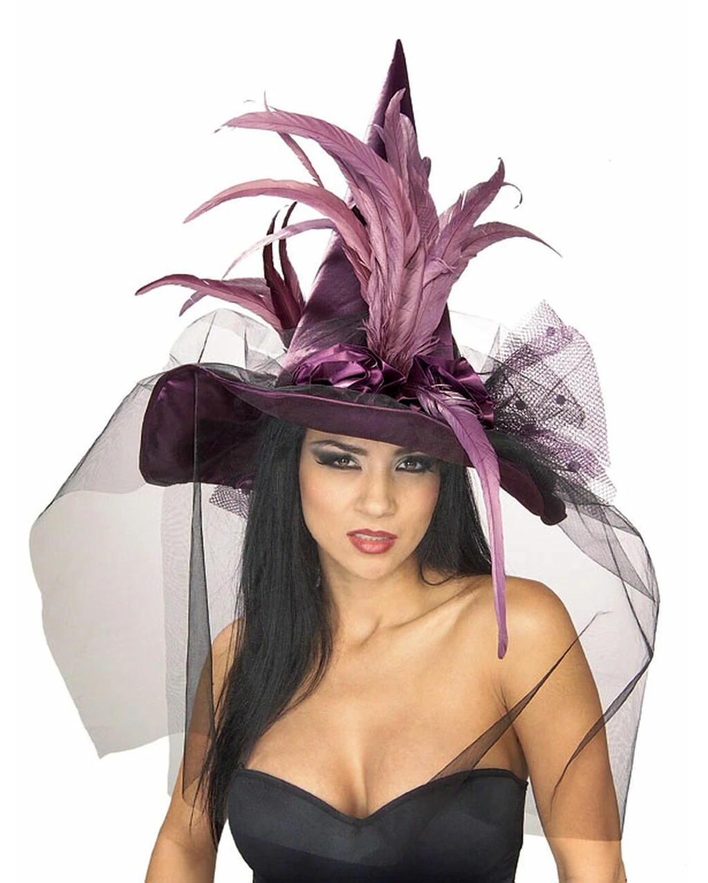- Lieferumfang: 1x Hexenhut mit Federn violett