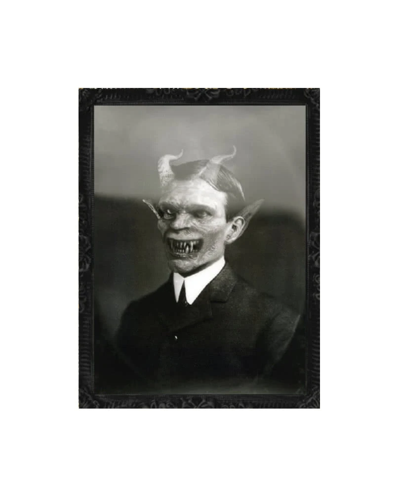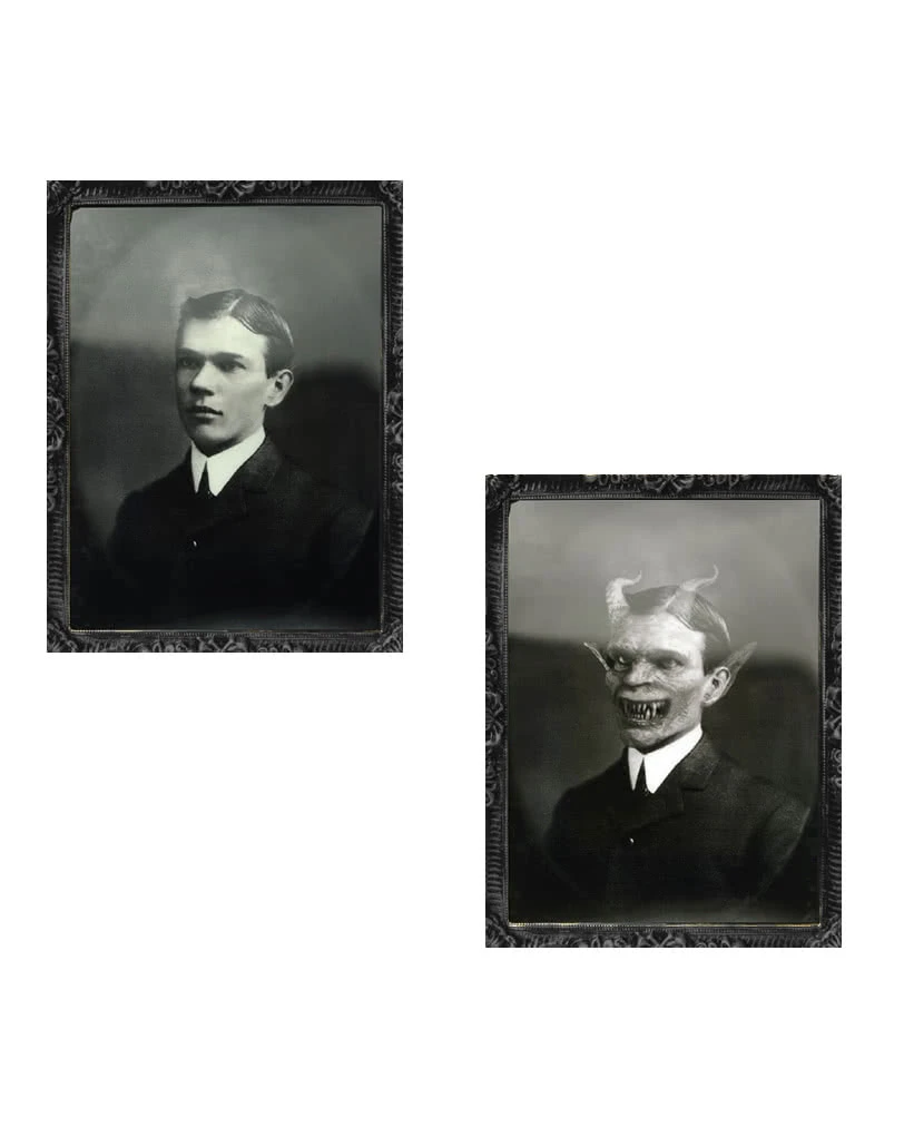 Das Hologramm Portrait Dämon ist ein typisches Wackelbild und zeigt entweder einen Jungen Mann mit Seitenscheitel oder eine gruselige Dämon Fratze mit Hörnern und sitzen Ohren und Zähnen. Das Wechselbild ist in schwarz und weiß gehalten und hat einen Rahmen mit einer verschnörkelten Bordüre. Alternativ haben wir auch noch das Hologramm Portrait Mutter mit Baby und das Hologramm Bild – Großmutter -.