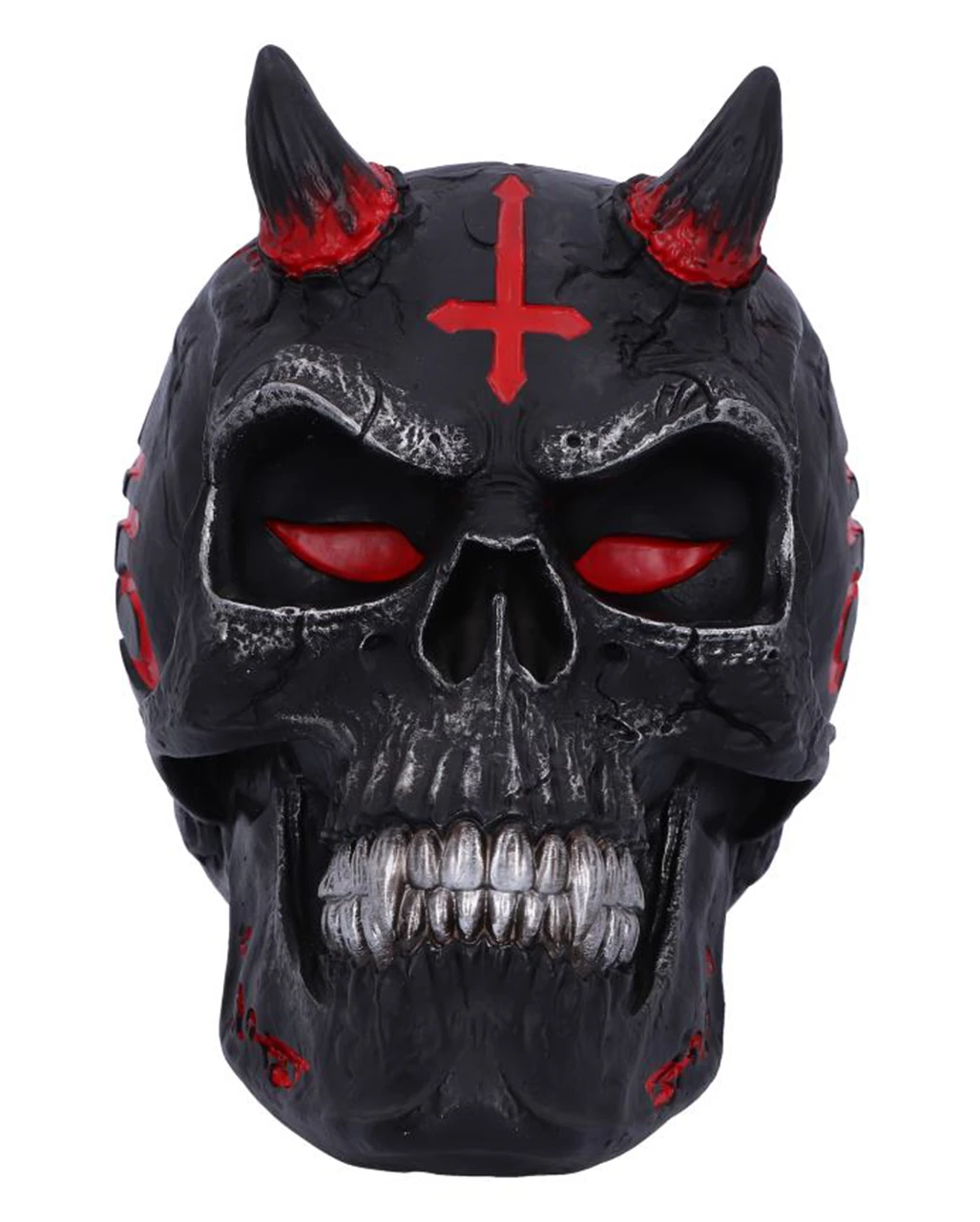 Gegossen aus feinstem Polyresin und anschließend fachmännisch von Hand bemalt, ist dieser gehörnte Höllenschädel die perfekte Ergänzung für jeden Gothic- oder Horror Sammlung.