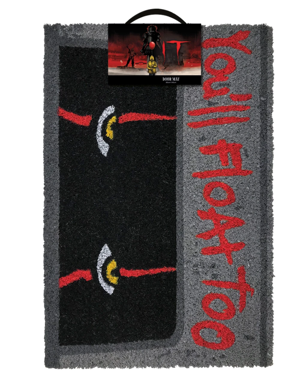 Die IT Pennywise Fußmatte ist ca. 40 x 60 cm groß und besteht aus robuster Kokosfaser. An der Unterseite sorgt eine Kunststoffbeschichtung dafür, dass die Matte nicht rutscht – schließlich geht Sicherheit vor! Die ES Türmatte ist ein geniales Wohnaccessoire und auch als Geschenkidee für Pennywise-Fans ein echtes Highlight. Entdecke auch die IT Pennywise Tasse für deine Fan-Sammlung!