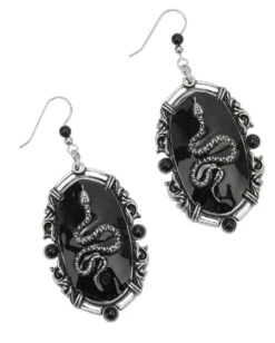 Die KILLSTAR Kissing Eve Ohrringe sind hochwertig verarbeitete Ohrringe für Kostüme und Alltag. Sie bestehen aus Kunstharz und Metall, was sie besonders langlebig macht. Die ca. 5 x 3 cm großen Ohrringe haben eine ovale Form und sind in einen filigranen Metallrahmen eingelassen. Dieser ist mit kleinen Schmucksteinen verziert. In der Mitte des Gothic-Ohrschmucks ist eine silberne Schlange erkennbar. Trage zu diesem Kostümschmuck ein dunkles Make-up und das edle Gothic Halsband mit Perlen und Stein