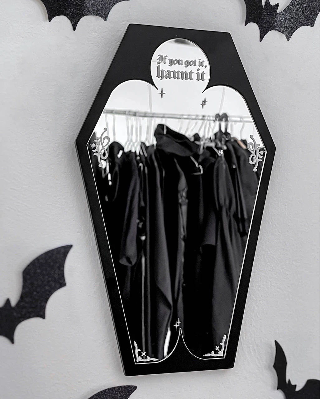 Der KILLSTAR Kitsu Spiegel ist ca. 32 x 19,5 cm groß und sargförmig designt. Es handelt sich um einen Spiegel mit gewöhnlichem Acryl Spiegelglas, das in einen schwarzen, sargförmigen Holzrahmen eingelassen ist. Die Befestigungshaken sind auf der Rückseite angebracht und erleichtern die Anbringung. Unsere KILLSTAR Wanddekoration für Gothics kommt mit dem Aufdruck: „If you got it – Haunt it“. Warte nicht länger und schlag zu! Noch mehr Gothic Homeware wie das Schwarzes Gothic Sarg Regal 50cm findest du hier im Shop.