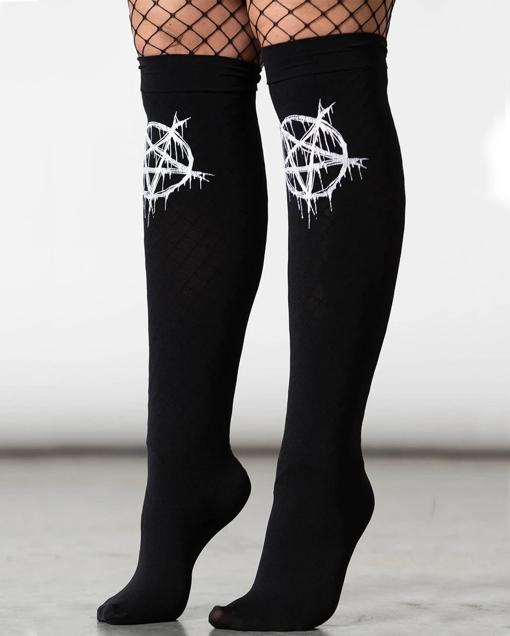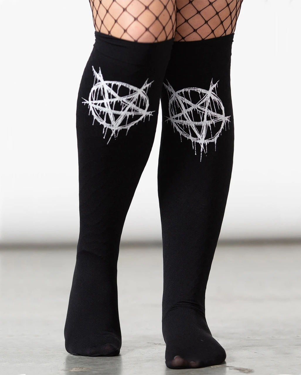 Mit den KILLSTAR Penta Blood Kniestrümpfen bist du von Kopf bist Fuß auf Mystik eingestellt. was natürlich perfekt zu dir passt. Dein Look ist nämlich grenzenlos geheimnisvoll wie ein schwarzer Abgrund. Du liebst Pentagramme und weißt um ihre magische Wirkung. Genau wie deine dunkle Seele will auch deine Körper gebührend gefeiert werden. Das tust du, indem du ihn bis ins letzte Detail mit Gothic Mode und Accessoires aus unserem Shop einkleidest.