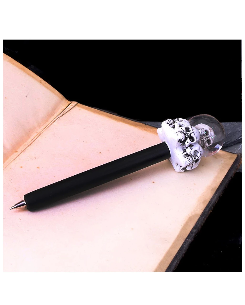 Der extravagante Kugelschreiber mit Totenkopf Glitzer Wasserkugel hat einen schlichten schwarzen Schaft, der einen komfortablen Griff mit einer Wasserkugel als Krönung trägt. In der Wasserkugel befindet sich ein Totenkopf, der durch aufschütteln von Glitter umgeben ist. Die Basis der Wasserkugel bildet ein Sockel aus kleineren Schädeln.