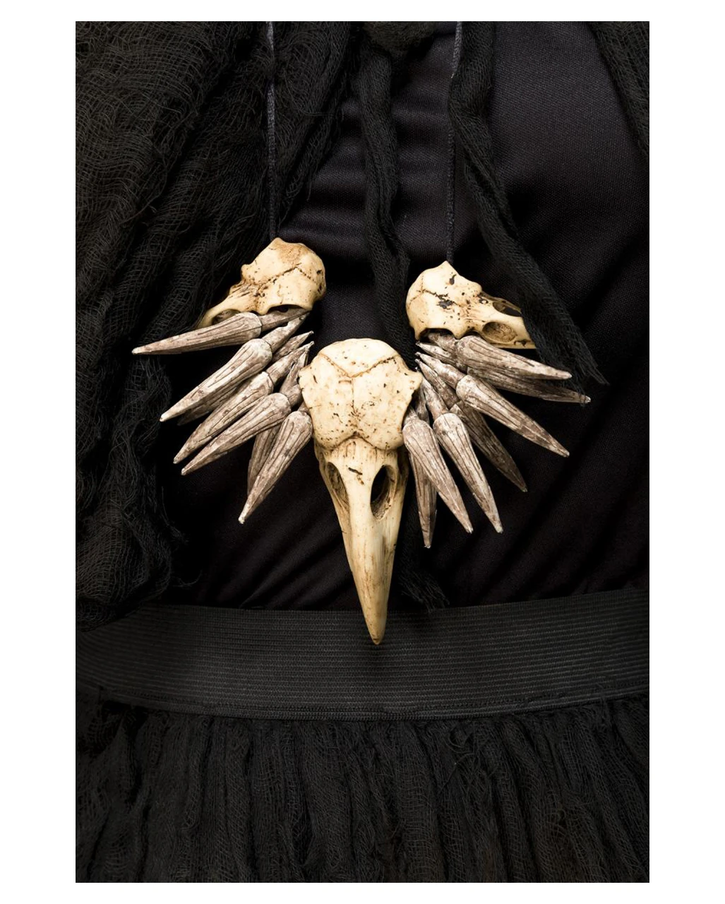 Das Komplettset für Frauen besteht aus langärmeligem Oberteil, Herrenrock im Fetzenlook, Kapuzencape, Gürtel, der fantastisch aussehenden Maske und der mit Raben-Skelettschädeln verzierter Halskette. Das gesamte Outfit sieht durch verschiedene Lagen, Farbspritzer und Fetzen verschlissen und gebraucht aus, was den Endzeit-Look unterstreicht und letztlich das gesamte bedrohlich wirkende Pestdoktor Damenkostüm ausmacht. Die Schnabelmaske ist aus Latex gefertigt und besitzt mit Netz unterlegte Augenaussparungen. Mit flexiblem Gummiband gehalten, sorgt die Maske für den optimalen Sitz unter dem Kapuzencape. Den Abschluss bildet die Halskette mit Kunststoff Raben Sklettschädel.