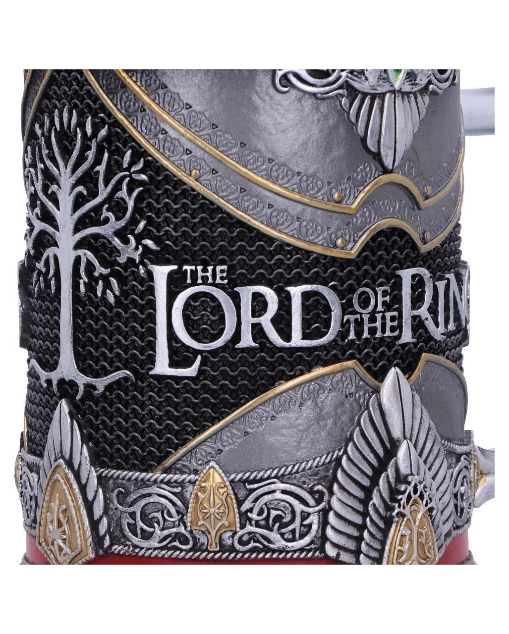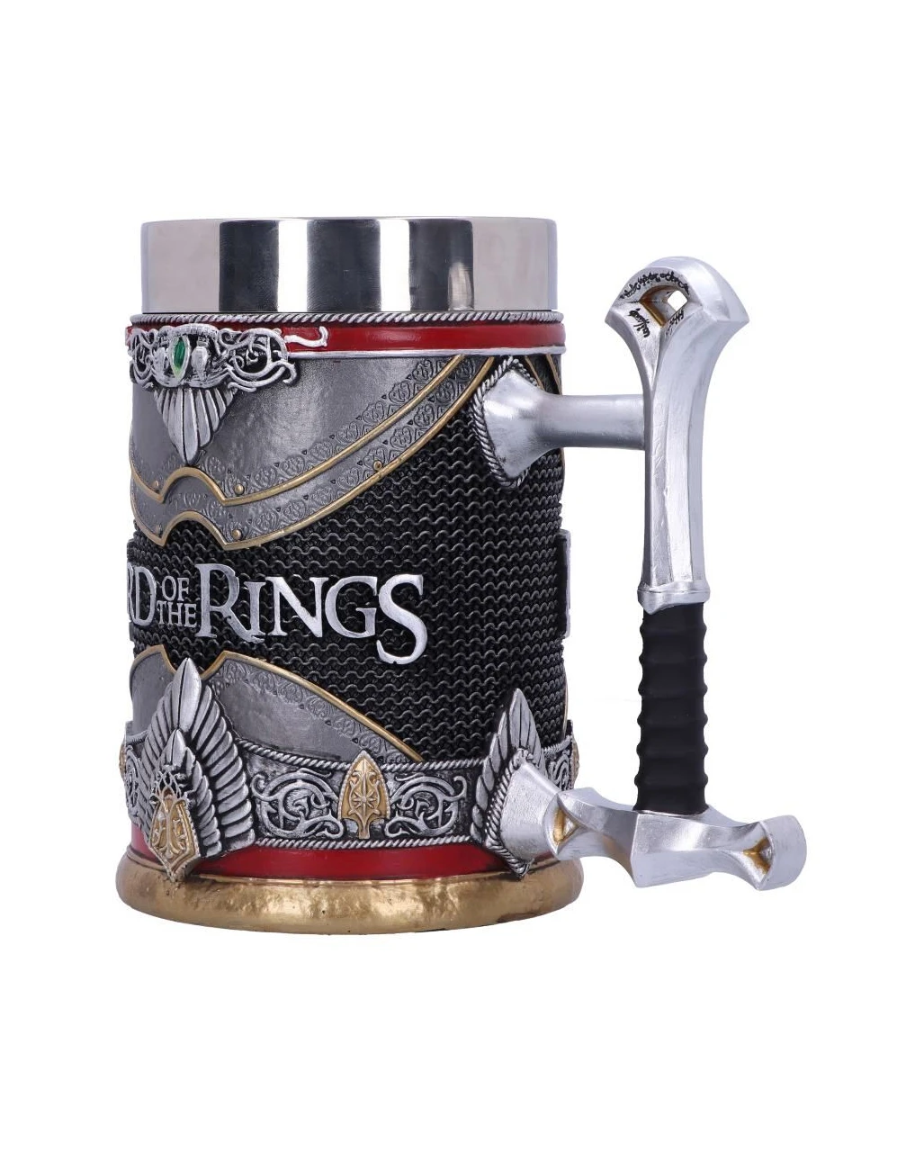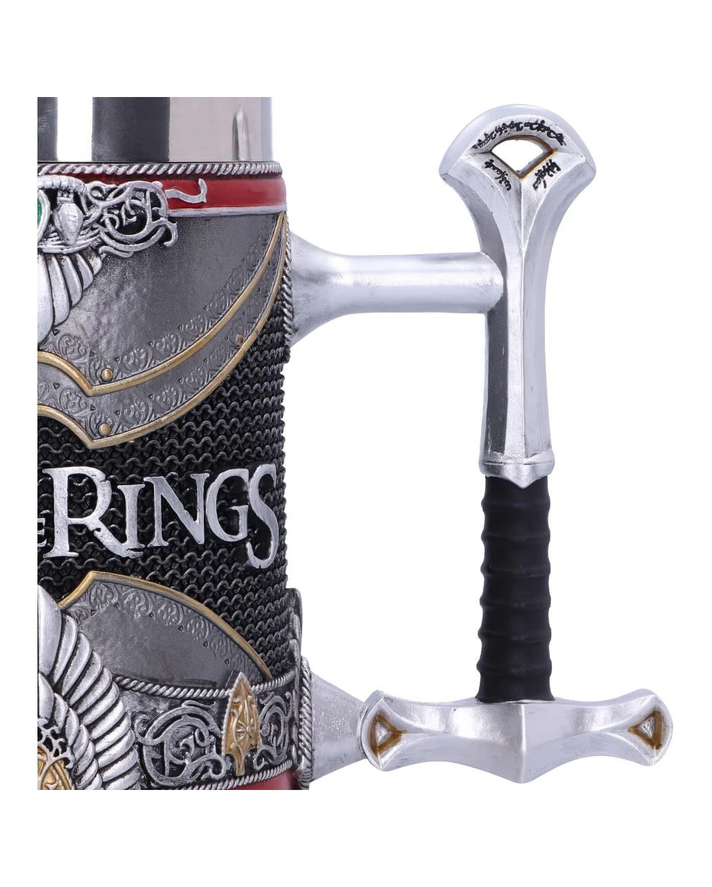 Offiziell lizenzierter Lord of the Rings Aragorn Krug, mit herausgearbeiteten Details wie Aragorns Schwert, Krone & Rüstung. Der Griff dieses Kruges wird durch den Griff von Anduril gebildet. Der Korpus des Kruges zeigt Aragorns Krone und ist in den Farben seiner Rüstung gestaltet.