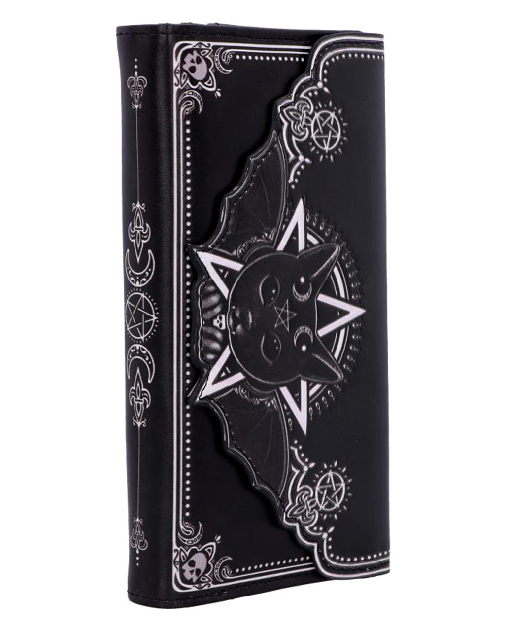 Unsere geprägte Malpuss Kult Cutie Geldbörse zeigt die mystische Vereinigung von Gut und Böse. Ein Vampirgeist, der durch Fledermausflügel, die aus dem Rücken der Katze herausragen, symbolisiert wird, zeigt ihren okkulten Charakter. Das Motiv ist ideal für dein alternatives Outfit, mit dem du abends deine Gruft verlässt, um die Nacht zum Tage zu machen. Jede Faser deines Körpers liebt die Dunkelheit. Mach die Dunkelheit zu deinem Begleiter und nimm unsere extravagante Gothic Geldbörse mit Katzen und Vampir Motiv als neues Lieblings Accessoire mit auf deine nächtlichen Streifzüge.