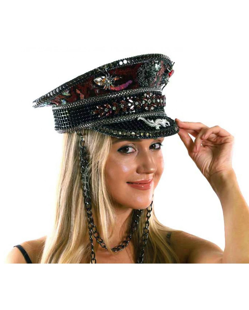 Diese Military Festival Schirmmütze Bordeaux ist eine aufwendig designte Parade Schirmmütze für Damen. Die festliche Kopfbedeckung schmückt dein Haupt mit Pailletten, Dekosteinen und einer eindrucksvollen Kette. So bist du für jedes Festival und für den Straßenkarneval bestens gekleidet! Das Kostüm-Accessoire passt zu venezianischen Fracks ebenso gut wie zu einem sexy Minikleid. Beides findest du in unserem gut sortierten Onlineshop!