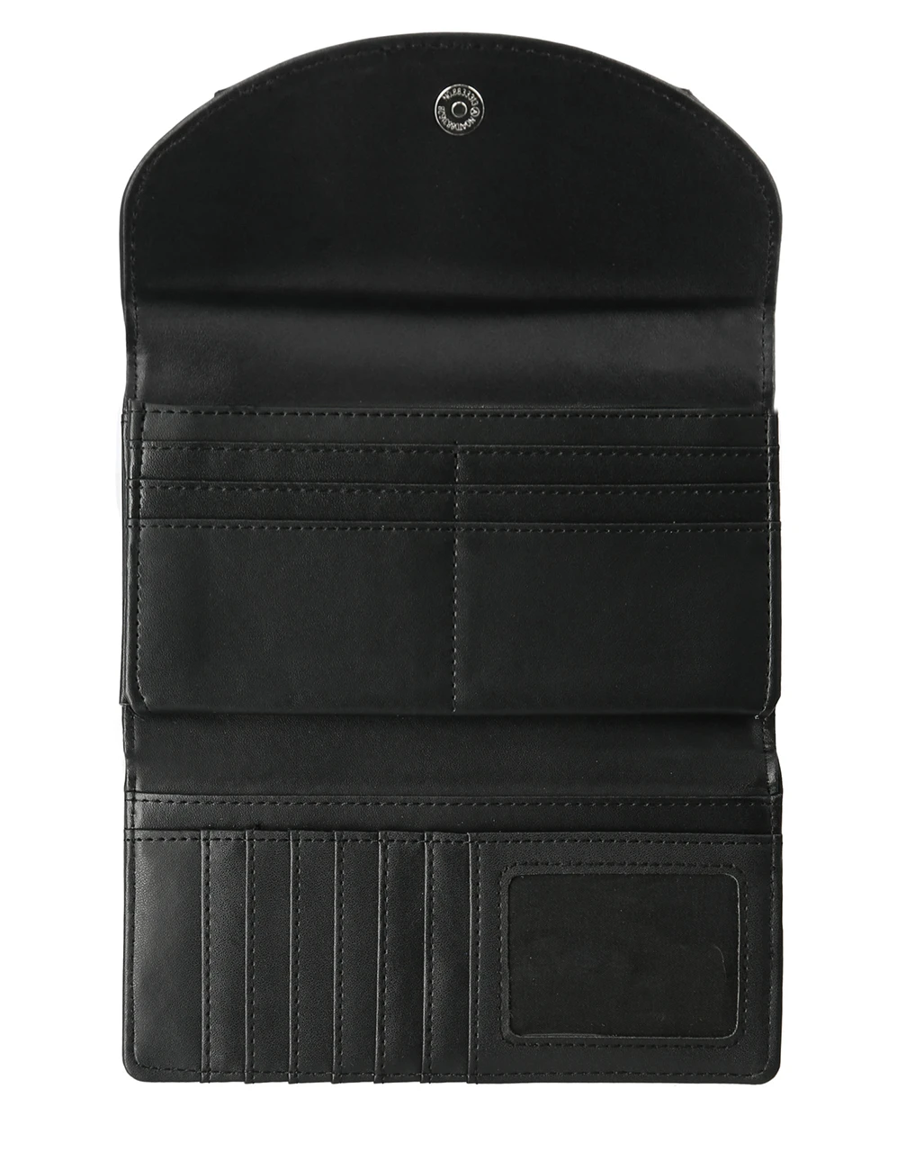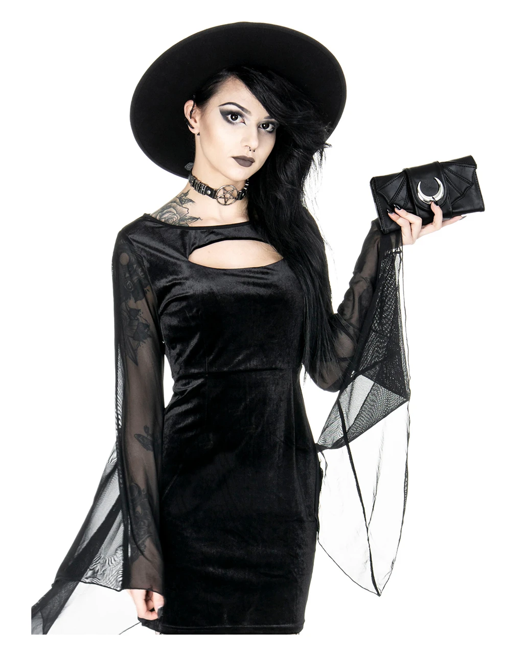 Die Moon Gothic Purse mit Fledermausflügel ist aus stabilem und festem Kunstleder gefertigt. Mittels Druckknopf lässt sich die Geldbörse öffnen. Der schwarze Fledermaus Geldbeutel ist länglich designt und verfügt über drei Hauptfächer für Geldscheine und ein Reißverschlussfach für Münzen. Auch Visitenkarten finden hier einen Platz. bewahre deine Moon Gothic Purse mit Fledermausflügel in unserer KILLSTAR Never Trust the Living Handtasche auf.