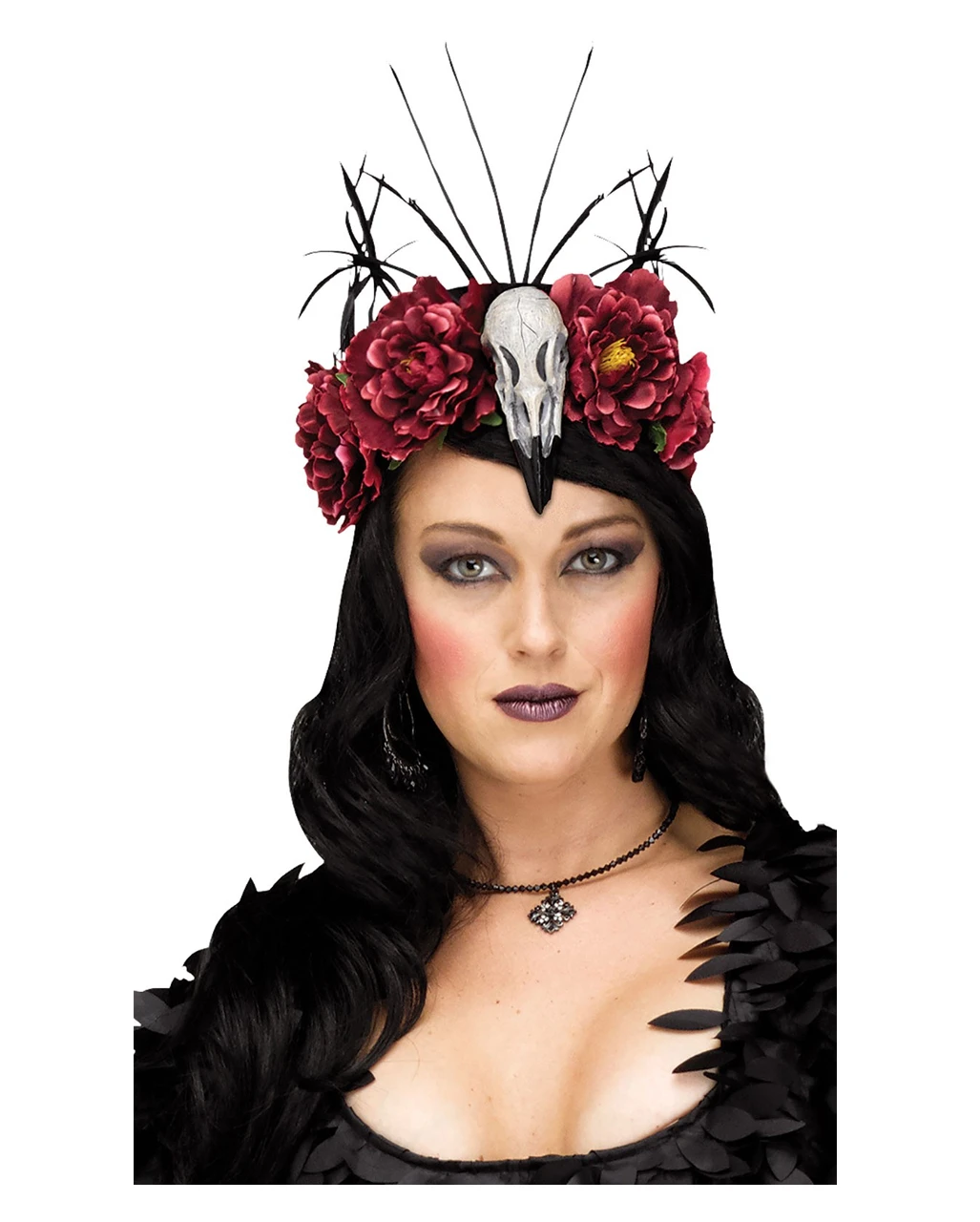 Der Raben Königin Kopfschmuck ist ein geniales Kosümzubehör für Halloween-Kostüme aller Art. Ob du dich als Dunkle Fee, schwarze Raben-Königin oder Horror-Hexe verkleiden willst – mit dem Blumenkranz mit Raben Skelettkopf wirst du deine Halloween Verkleidung um einiges aufwerten. Der Raben Königin Kopfschmuck ist eine außergewöhnliche Blumenkrone mit gruseligen Details. Mit der passenden Perücke kombiniert, wird dieser Halloween Blumen Kopfschmuck ideal zur Geltung kommen und seiner Trägerin eine besonders skurrile Note verleihen.