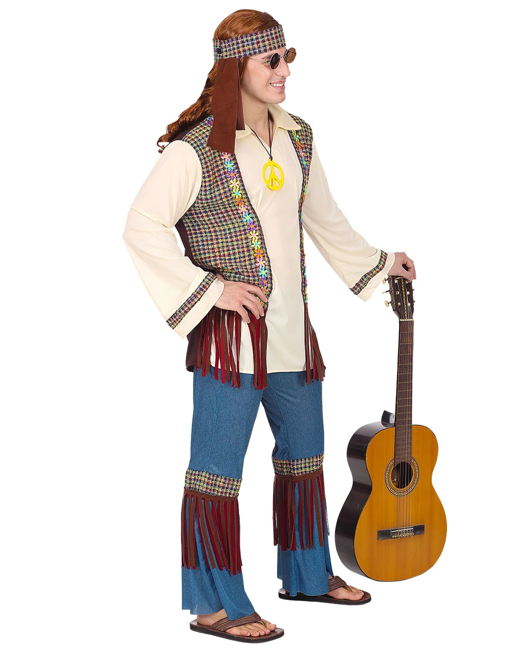 Du bekommst ein San Francisco Hippie Kostüm bestehend aus einer Hippie Hose mit breitem Schlag und Fransen, einem Hemd mit Weste sowie einem Stirnband und einer Peace-Kette. Die Herren Hippie Verkleidung ist in Größe S-XL verfügbar und bietet durch die lockere Schnittform höchsten Tragekomfort. Kombiniere das Flower Power Männer Kostüm mit einer Hippie Männerperücke und lässigen Sandalen. Noch mehr 60er & 70er Jahre Kostüme findest du auf Horror-Shop.com!