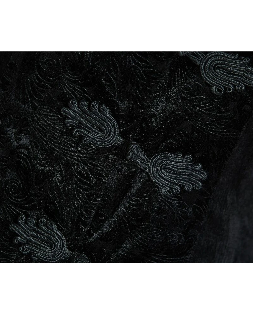 Besitze jetzt ein schwarzes hochwertiges Jackett im viktorianischem Gothic Style. Der Damenfrack ist aus luxuriös wirkendem Samtstoff gearbeitet, der eine seidenweiche Oberfläche besitzt. Ein florales Stickmuster, eine extravagante Borte, Ärmel und Kragen sorgen für Aufmerksamkeit.