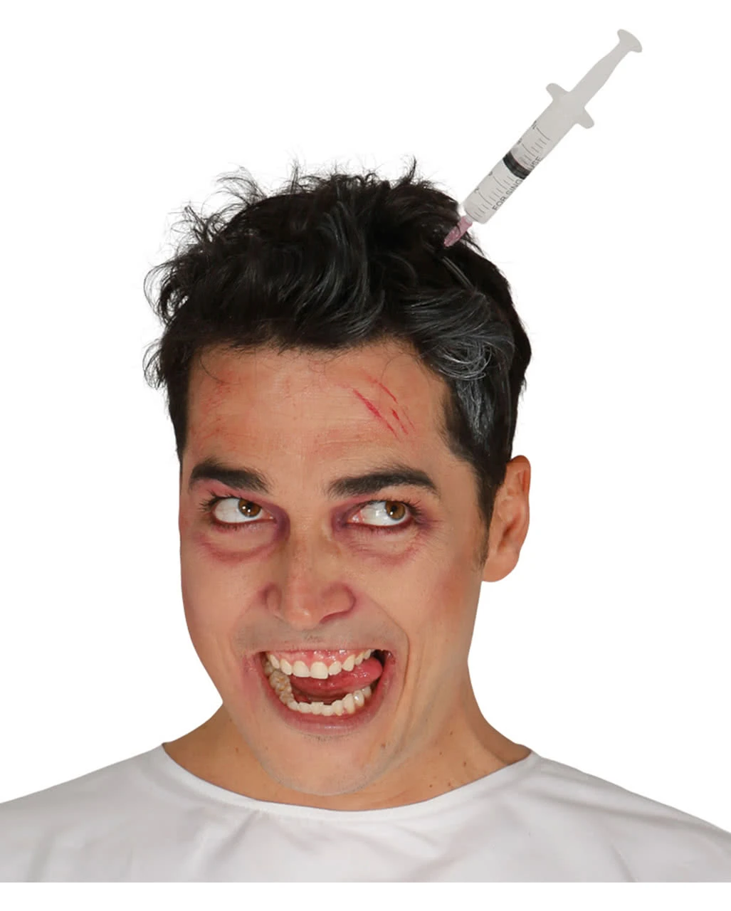 Die Horror Spritze ist ca. 12 cm lang und lässt sich mit ca. 10 ml – zum Beispiel Kunstblut – befüllen. Sie wird seitlich auf den dehnbaren und universell passenden schwarzen Haarreif gesteckt. Der Spritze im Kopf Haarreif ist ein schauriger Horroreffekt und lässt sich super mit dem Zombie Chirurg Kostüm kombinieren. Zum Befüllen der Halloween Spritze eignet sich das Filmblut / FX Blood 30ml.