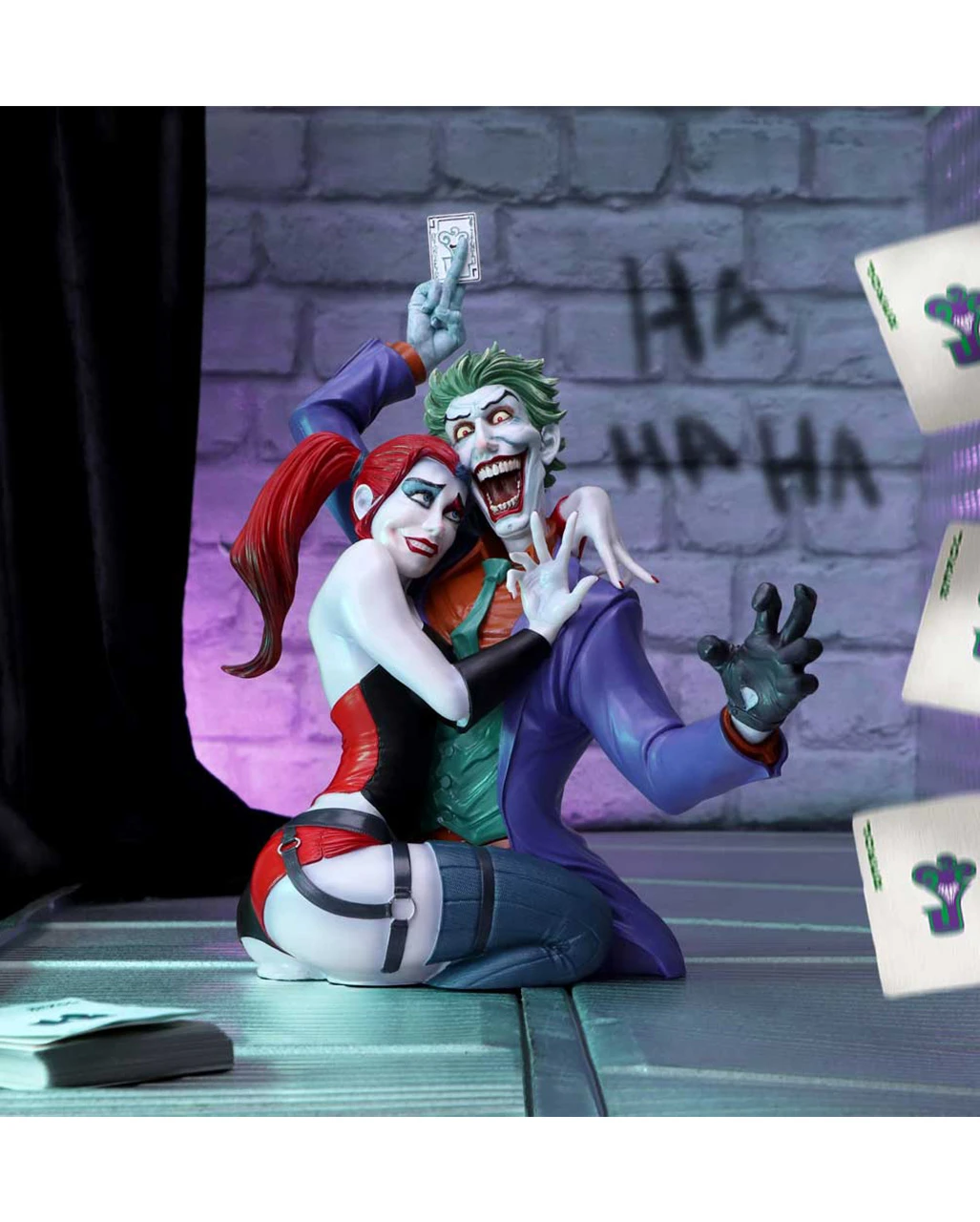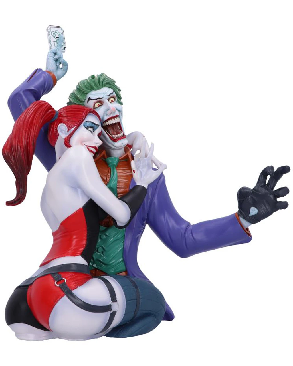 Unsere The Joker & Harley Quinn Büste ist aus Kunststein gegossen, was sie besonders robust macht. Der Joker trägt seinen charakteristischen lila Anzug und hat eine Spielkarte in der Hand. Harley kommt in ihrem schwarz-roten Outfit und den zwei unverkennbaren Zöpfen. Diese einmalige Harley Quinn Figur mit Joker ist liebevoll von Hand bemalt und eine Bereicherung für jede DC-Comics Figurensammlung. Sichere dir auch die DC Comics Der Joker Krug 15,5cm und die Imperial Palace Harley Quinn Funko POP! Figur