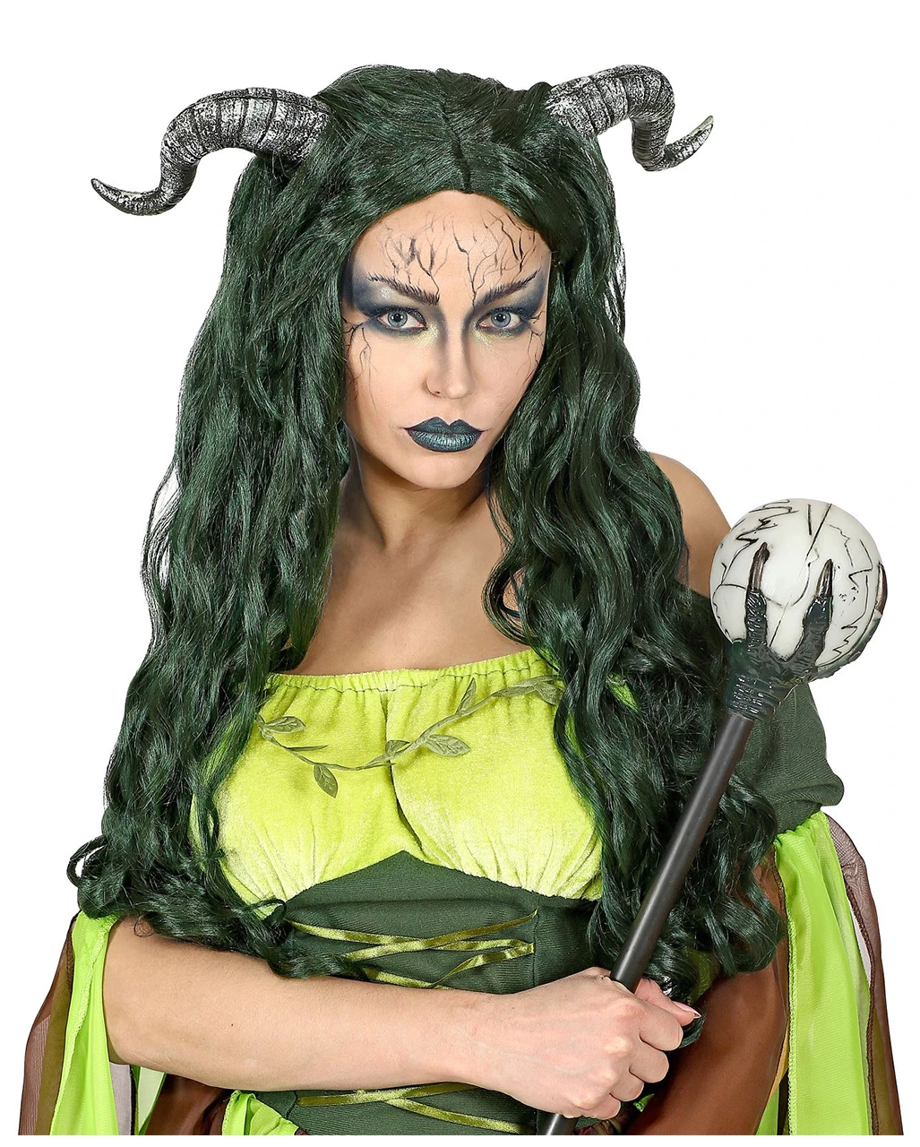 Die Waldhexen Perücke mit Hörnern ist in One Size Damengröße verfügbar. Dunkelgrünes Kunsthaar und graue Hörner machen deinen Fantasy-Look komplett. Ob Hexe, Naturgöttin, Teufels-Nixe oder Zombie-Wesen: Mit der grünen Perücke für Walpurgisnacht & Halloween gelingt dir jedes Outfit! Da darf auch ein Grünes Horror Make Up nicht fehlen.